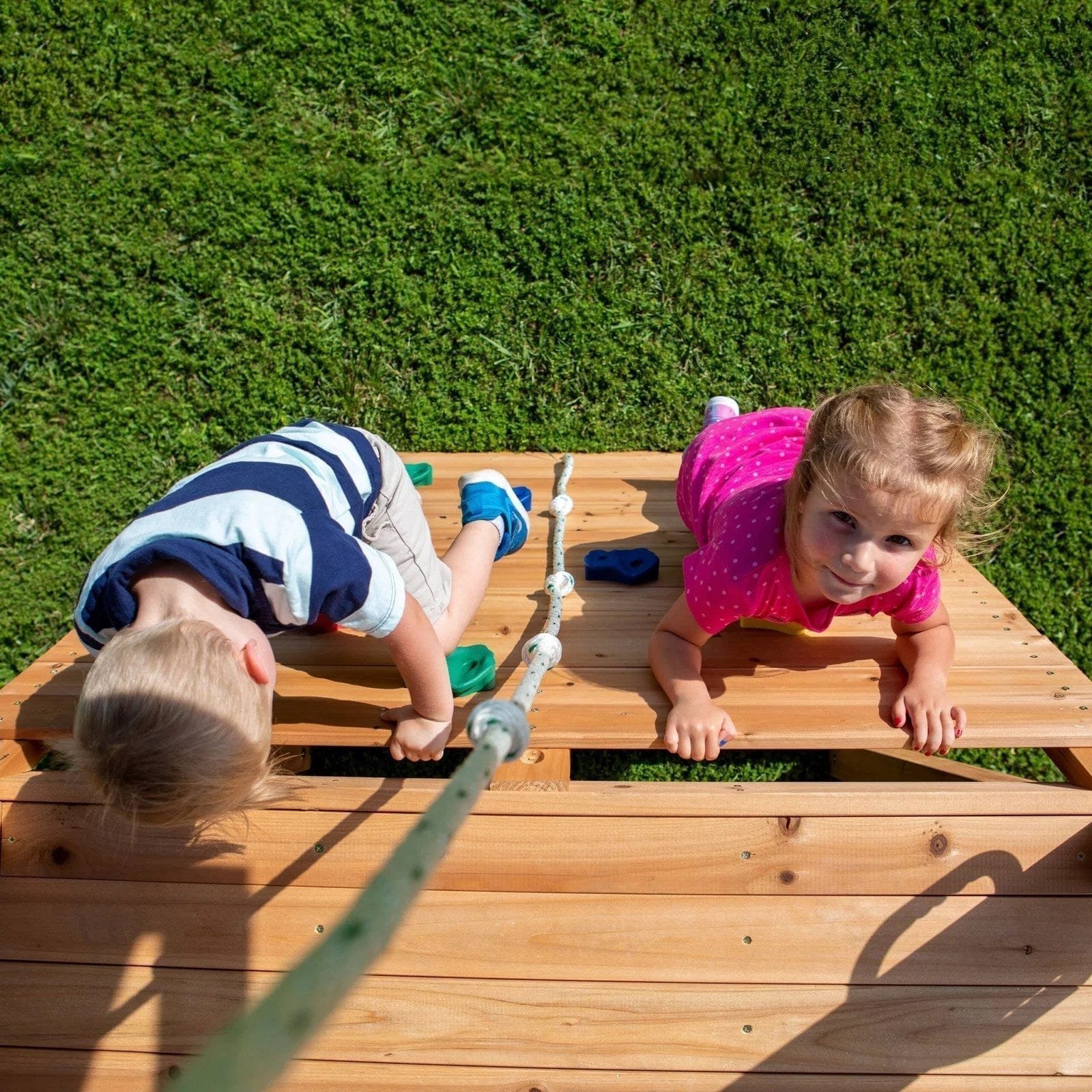 • Full width, double rock wall with climbing rope offers a much larger climbing structure that can allow 1 or 2 children to use at the same time.